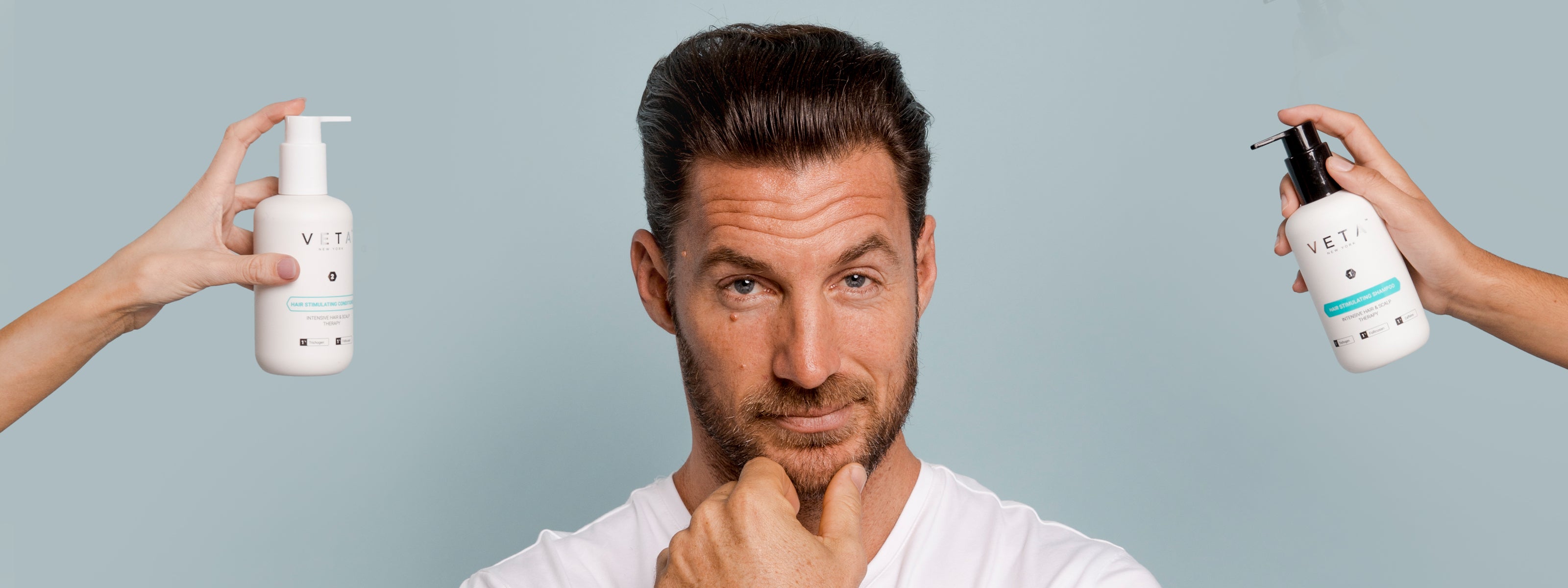 Whether you’re looking to get in front of hair loss before it happens or have already experienced thinning, the Veta Hair Stimulating System for Men is your offensive and defensive hair care regimen.