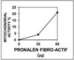 The first graph shows how mitochondrial activity increases with greater concentrations of Pronalen Fibro-actif (µg). In this case the concentration of the mitochondrial protein was 7.43 µg and the process was carried out without incubation.