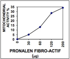 Figure 2 shows us the increase in the mitochondrial activity with greater concentration of Pronalen Fibro-actif (µg), as the oxygen levels detected in the cell fall progressively. In this case, the mitochondrial protein concentration was in the order of 12.23 µg and the process was carried out after 15-18 hours of incubation.