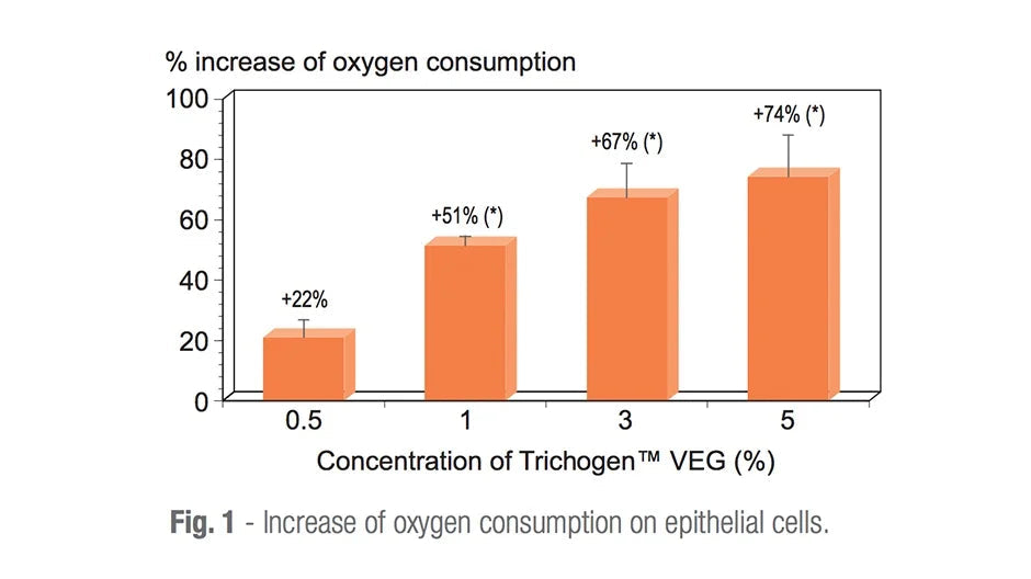 A significant and dose-dependent increase of oxygen consumption by epithelial cells has been demonstrated, representative of an increase in cell metabolism/vitality. Trichogen™ VEG clearly improves cell vitality.
