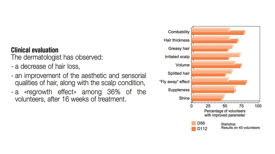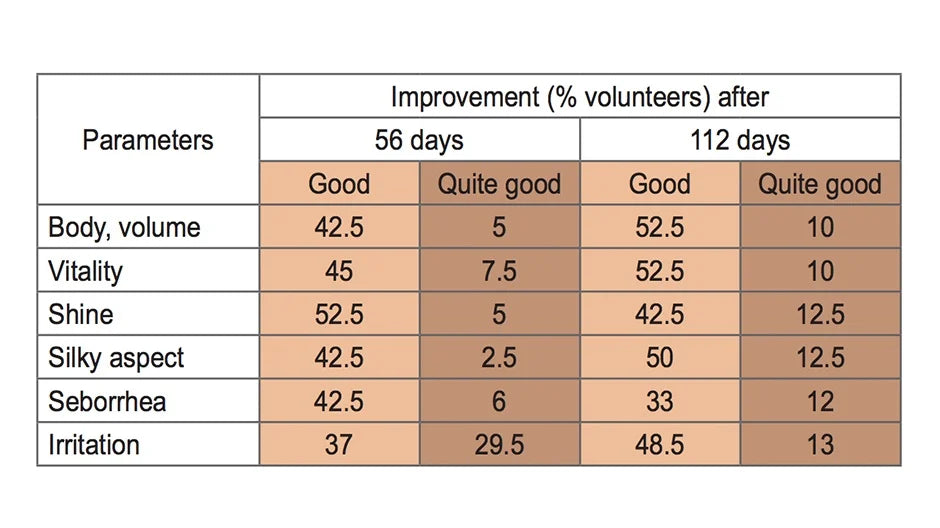 - Improvement of hair aspect and sensorial hair qualities, decrease of oily look, conditioning, repairing, improvement of the dry, dull look, increase of suppleness and easier combing.