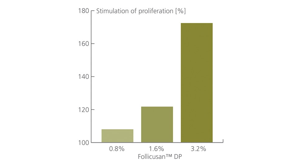 Stimulation of proliferationDermal papilla cells are the most important cell type found in the hair root. A strong stimulatory influence of Follicusan™ DP on dermal papilla cslls was observed. This feature is essential for the development of new hair in order to increase the number of anagen hair and effectively fight hair loss.