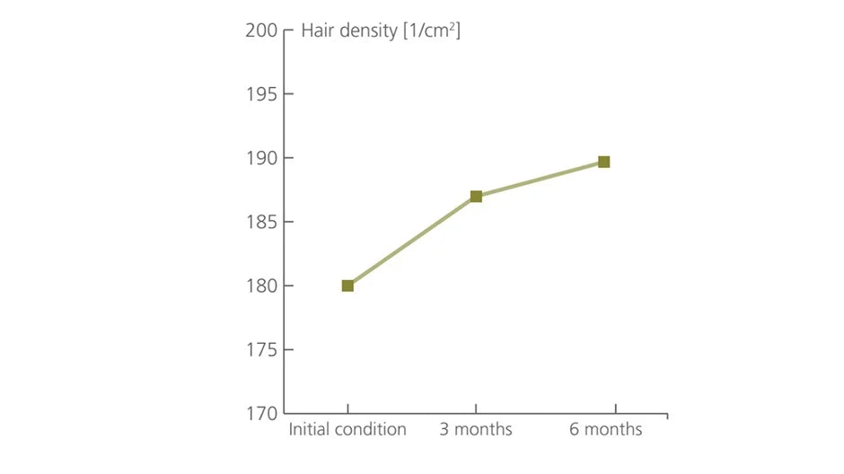 Impact on hair densityDensity is the number of hairs per cm2 on the scalp. The 24 volunteers, suffering from alopecia androgenetica, showed a reduced hair density of only ~180 /cm2. With daily use of Follicusan™ DP a positive trend could be noticed after only 3 months, indicating that Follicusan™ DP was able to re-activate the hair cycle.