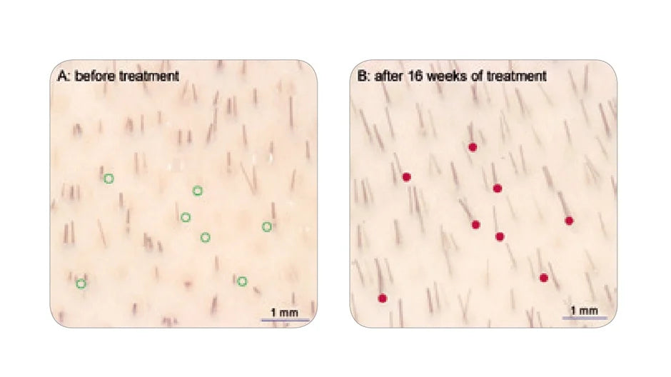 Follicusan™ DP stimulates the functionality of the dermal papilla cells at the base of the hair follicles, thus counteracting premature hair loss. It increases the number of anagen hair follicles (growth stage) and decreases that of telogen hair follicles (resting stage). Hair density as well as cumulative hair thickness is increased.
