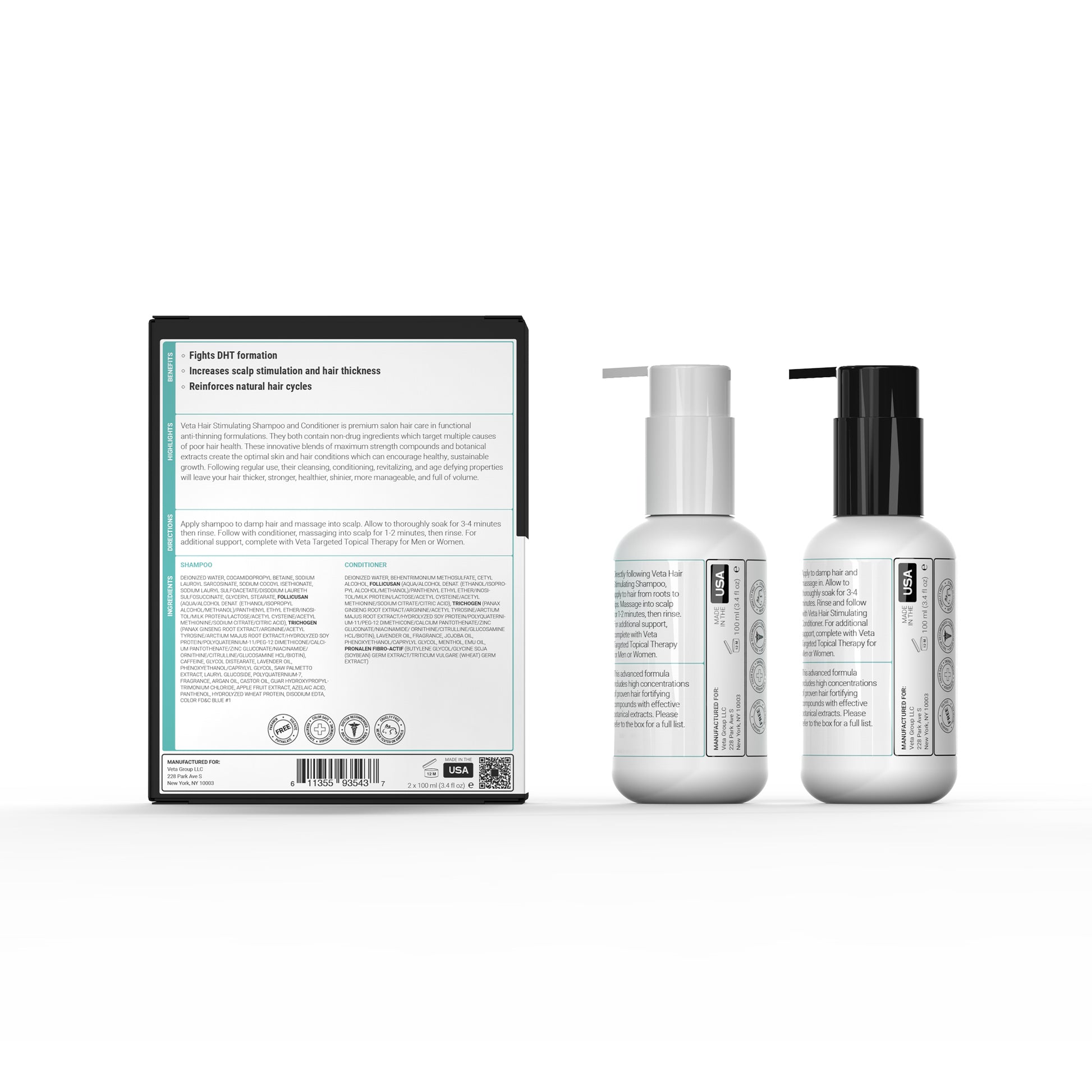 Veta Hair Stimulating Shampoo and Conditioner is premium salon hair care in functional anti-thinning formulations. They both contain proven non-drug ingredients which target multiple causes of poor hair health. This innovative blend of maximum strength compounds and botanical extracts creates the optimal skin and hair conditions needed to encourage healthy, sustainable hair. Deeply cleansing and nourishing, this shampoo and conditioner can prolong the anagen (growth) phase and shorten the telogen (shedding) phase. Following use, its cosmetic and therapeutic properties will leave your hair thicker, healthier, shinier, more manageable, and full of volume. Hair and scalp recover a second youth with the Veta Hair Stimulating System.